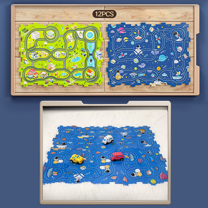 Välj mellan dinosaurie-, djur-, stad- och rymdtema. Billeksetet inkluderar olika spår, loopar och ramper som enkelt kan monteras ihop för att skapa spännande racingäventyr. Lek med detta pusselspår-villageset tillsammans med ditt barn för att njuta av familjekul och stärka föräldra-barn-relationen.