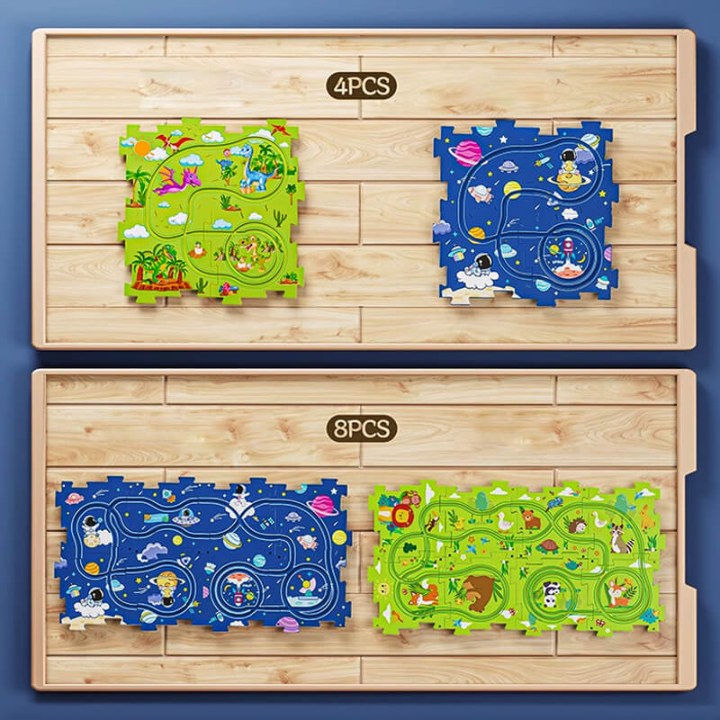 Pusslen är tillverkade av högkvalitativ ABS och har släta kanter och hörn utan vassa partier, vilket gör dem säkra för barn att leka med. Bilen rör sig automatiskt längs spåret, vilket är roligt och håller barnen borta från elektronik.