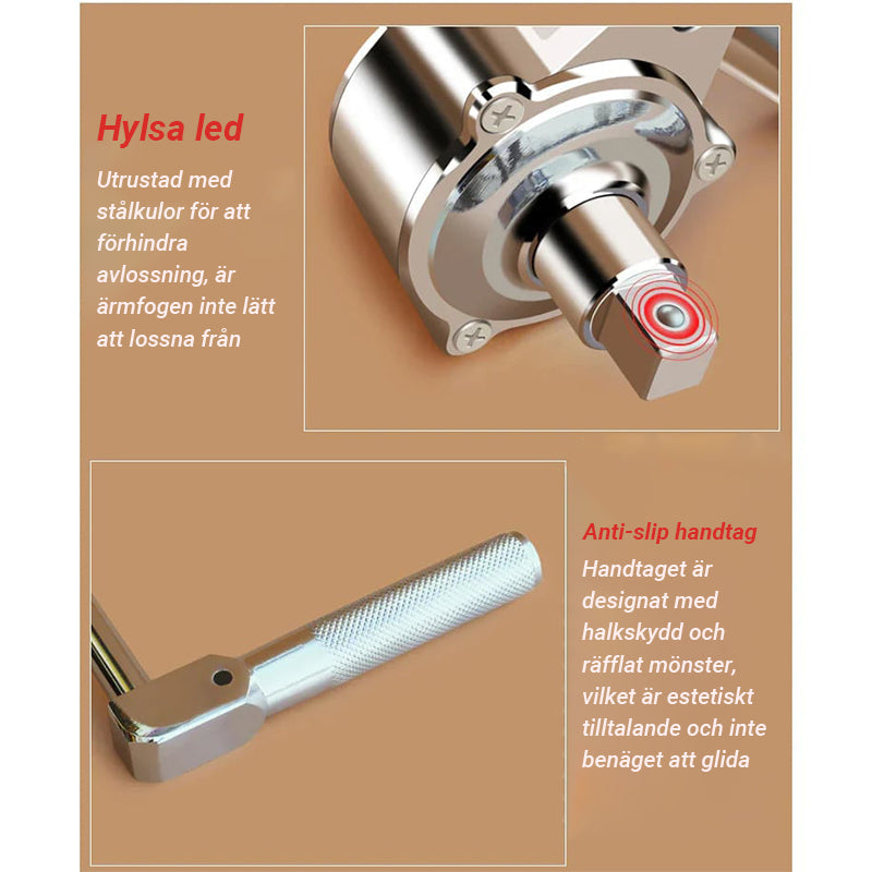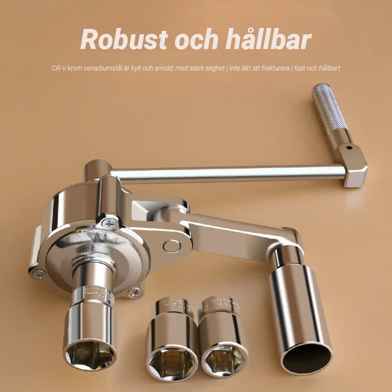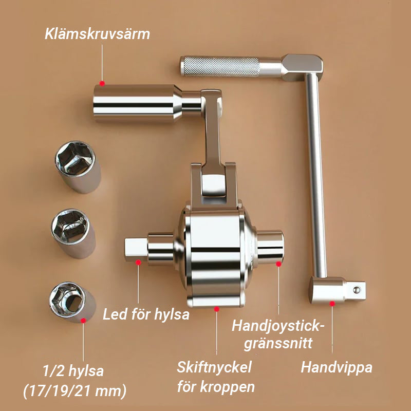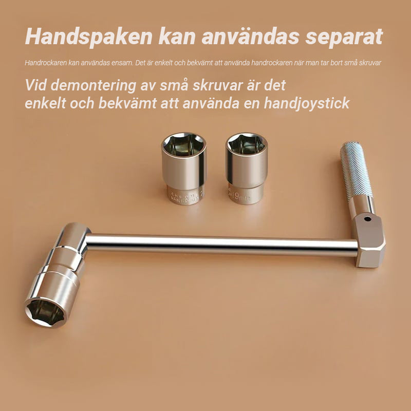 Enkel att anvÀnda - anslut bara vevhandtaget och skjut den andra fasta hylsan pÄ nÀrmaste mutter för att fÄ en stabil stödposition. Börja lossa dessa muttrar och anvÀnd handjoysticken nÀr du demonterar den lilla skruven. Handjoysticken kan anvÀndas ensam, enkelt och bekvÀmt
