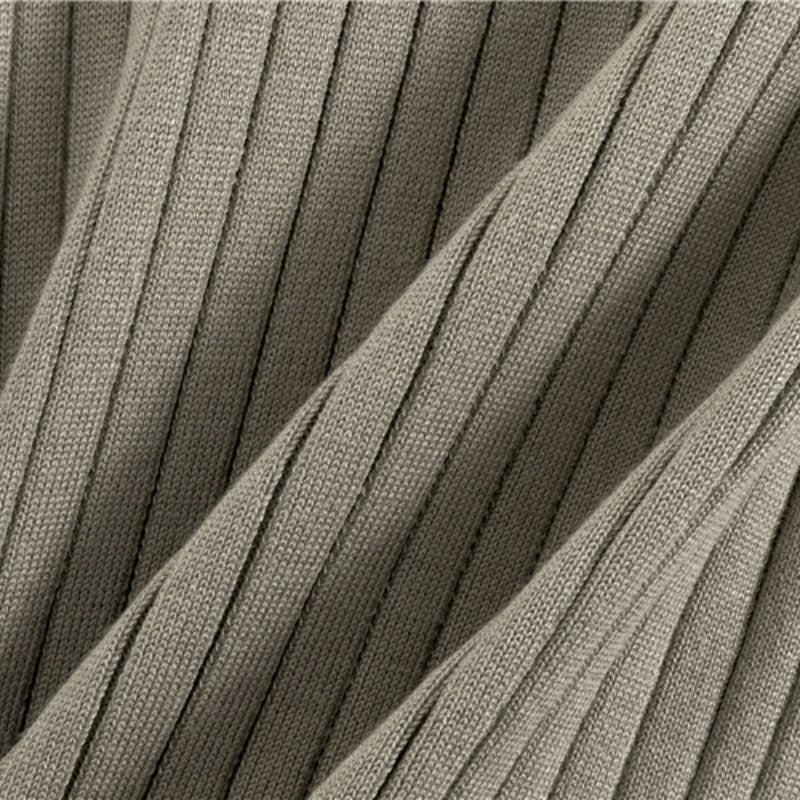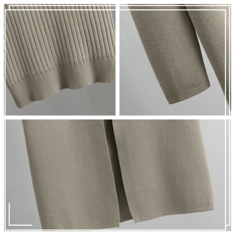 STRĂMSTRECKMĂNSTER: Den Ă€rmlösa stickade vĂ€sten har ett mönster med vertikala rĂ€nder, vilket tillför en touch av raffinemang och bryter upp monotoni i enhetliga fĂ€rger. Denna designdetalj ökar det övergripande sofistikeringen hos setet.