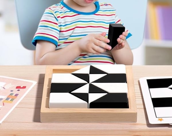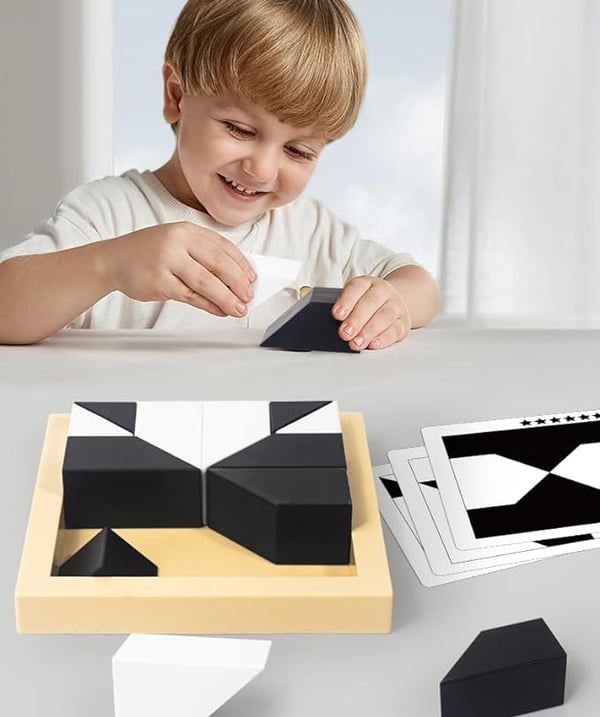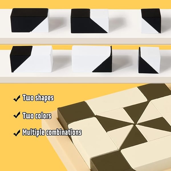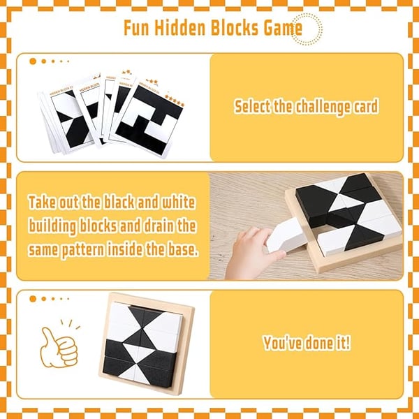 ✨ Utvecklande Lek:Introducera dina barn till hjärntränande pussel med våra pedagogiska byggklossar. Med flashkort och byggklossar i svart och vitt, får barnen utmana sig själva genom att återskapa mönster och gömma klossarna på rätt sätt. En unik och stimulerande upplevelse för hjärnan.