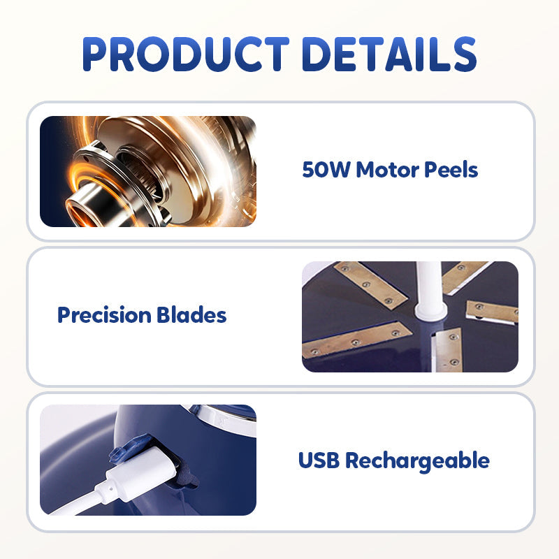 SKALA SOM MAGI, UTAN ANSTRÄNGNING OCH UTAN KLADD – Tryck bara på en knapp och låt maskinen göra jobbet – perfekt skalad frukt på bara 25 sekunder. Den kraftfulla 50W-motorn arbetar effektivt och tyst, tack vare smart kylteknik som förhindrar överhettning.