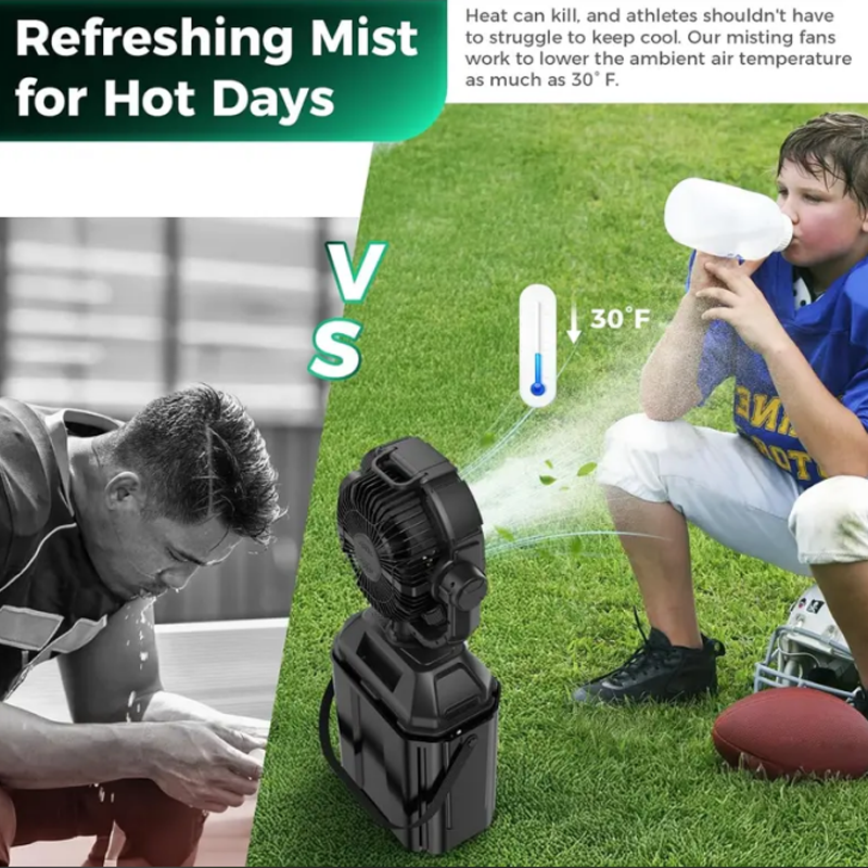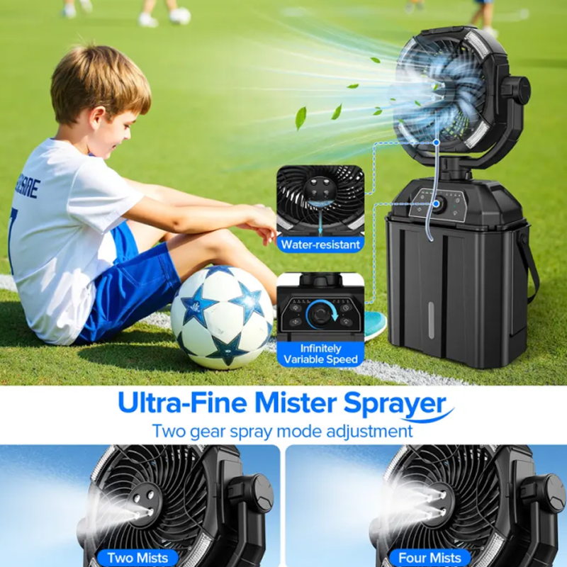 DUBBLA SPRUTHUVUDEN FĂR INTENSIV KYLNING: Utrustad med tvĂ„ justerbara sprutmunstycken som fördubblar dimutmatningen jĂ€mfört med modeller med ett enda huvud. Den fina, jĂ€mna dimman kombineras med luftflödet för att skapa en iskall uppfriskning, vilket eliminerar kvavhet Ă€ven under sommarens hetaste perioder i utomhusmiljöer.