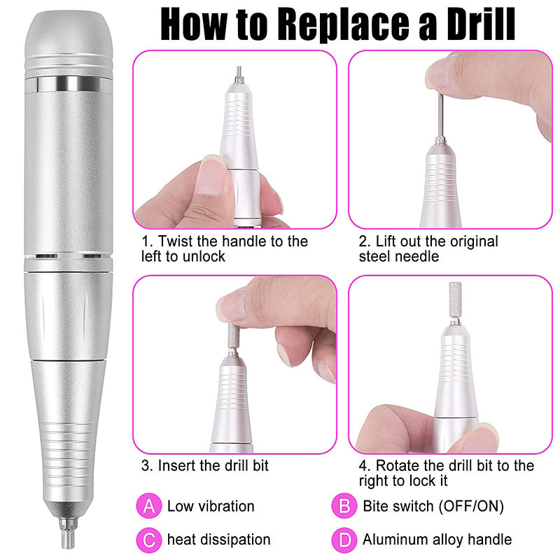 MÅNGSIDIGA SLIPHUVDEN OCH ENKEL BYTNING – Setet inkluderar sex sliphuvuden som är anpassade för olika nagelvårdsbehov, såsom borttagning av död hud, förhårdnader och polering. Att byta huvuden är enkelt: stäng av enheten, lås upp genom att vrida åt vänster, dra ut huvudet, sätt in det nya vertikalt och lås genom att vrida åt höger, vilket gör underhållet snabbt och enkelt.