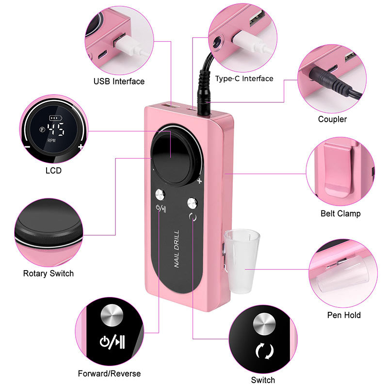 MULTI-INTERFACE DESIGN MED EXTRA USB-LADDNING – Utrustad med USB, Type-C, poleringsgränssnitt och krokport, stödjer detta verktyg praktiska laddningsalternativ och användbarhet. Dessutom fungerar USB-porten som en laddare för mobila enheter, vilket tillför praktiskt värde utöver nagelvård.