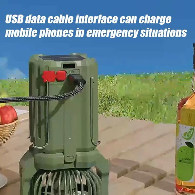 SOLENERGIEFFEKTIVITET – Utnyttja solens kraft med den inbyggda solpanelen för miljövänlig laddning! Det uppladdningsbara batteriet lagrar energi för 8–12 timmars belysning eller fläktanvändning. Inga sladdar, inget krångel – perfekt för camping, uteplatser eller nödsituationer. Hållbar energi möter bekväm off-grid-användning!