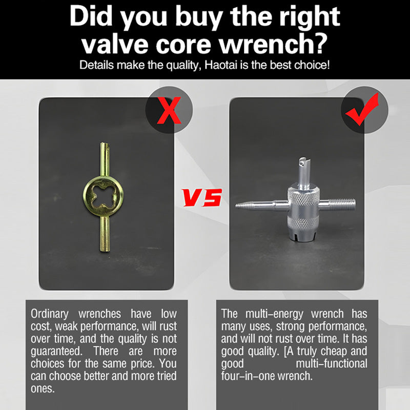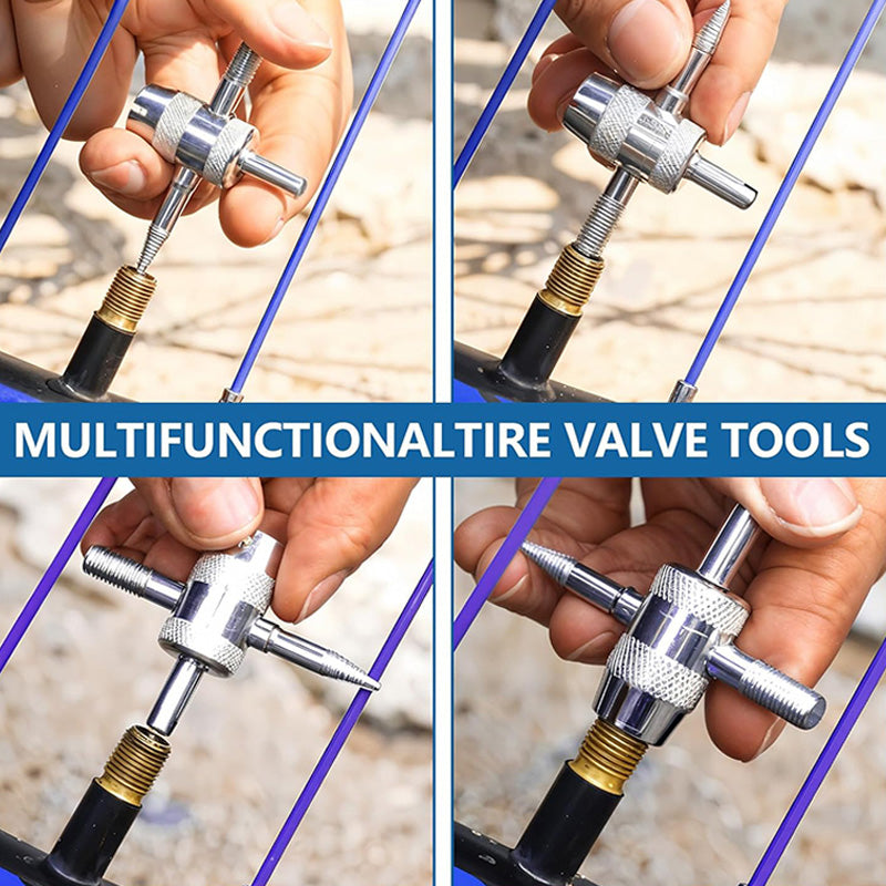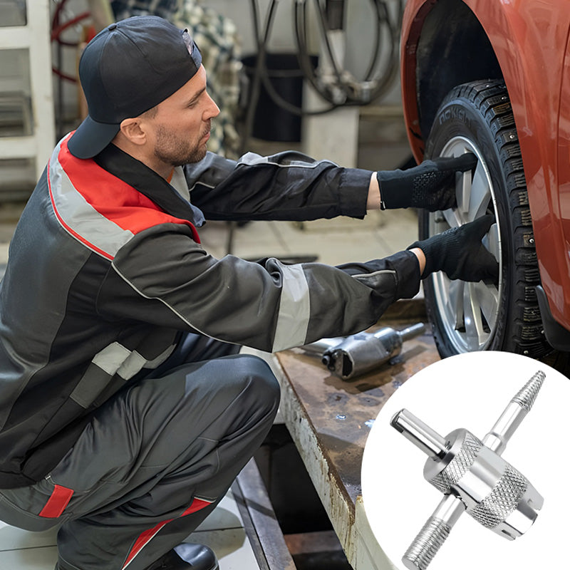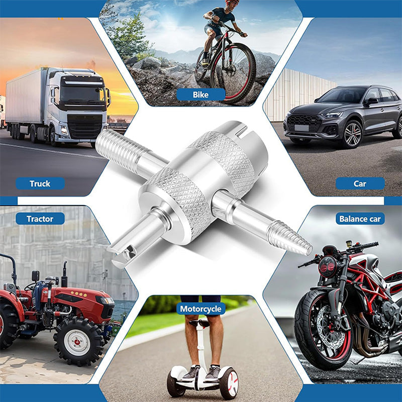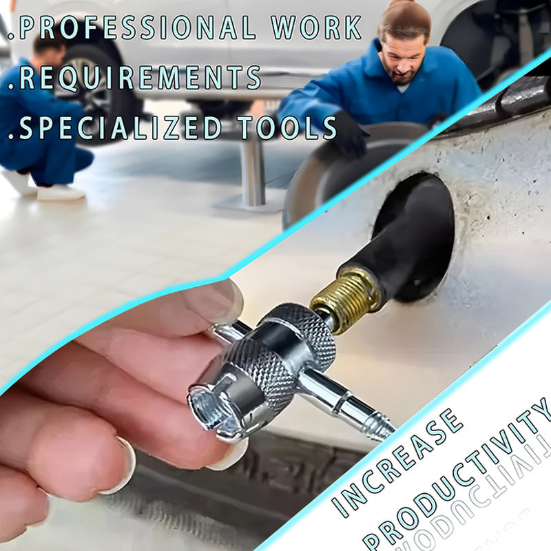 MULTIFUNKTIONELL DESIGN: Verktyget är utformat med en praktisk och effektiv 4-i-1-struktur och stöder enkelt borttagning av ventilkärna, dragning av stång, tömning av däck och andra viktiga däckrelaterade uppgifter.